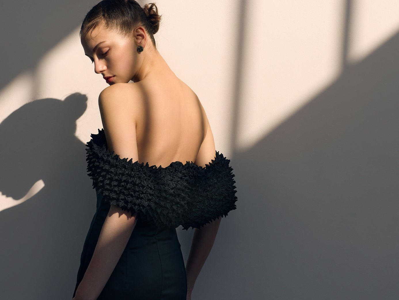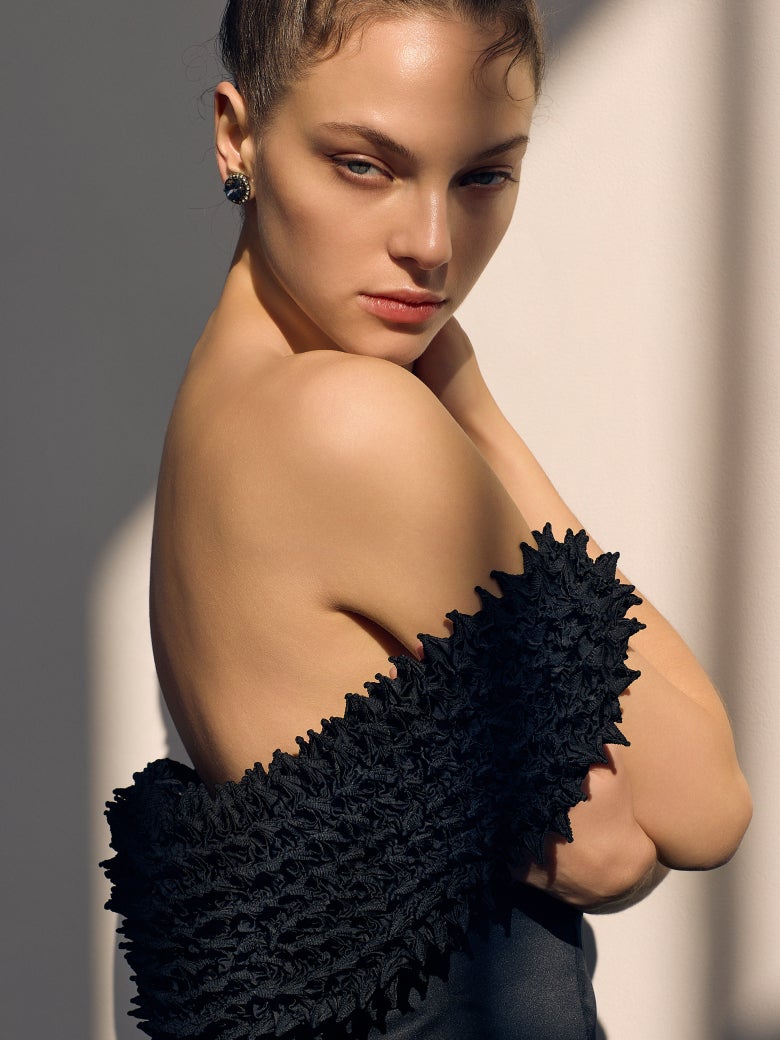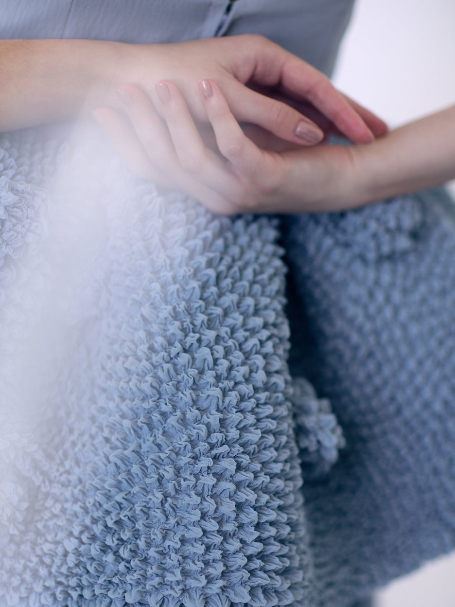 今回のコレクションでは、エッジの効いた凹凸が特徴的な「蜘蛛絞り」、ふっくらと均一に並んだシボが美しい「横三浦絞」、木の年輪や木目の流れを思わせる「杢目絞り」という三つの技法を採用しました。