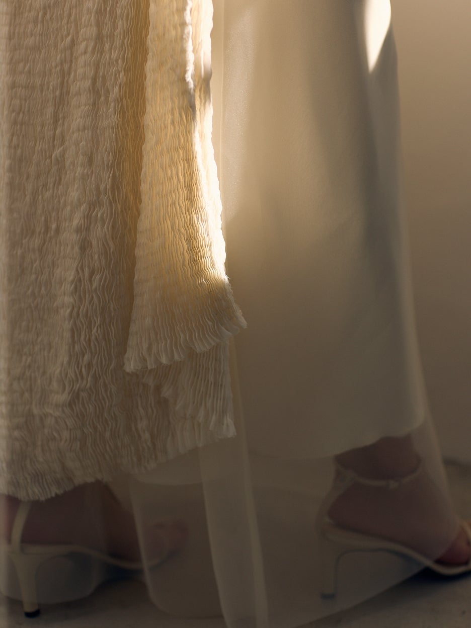 横三浦絞のベースドレスには、滋賀県長浜市で江戸時代から続く「浜縮緬」を使用しています。横三浦絞に合うドレス生地を探して数多くの生地を試す中で、最も調和したのが、やはり日本の技術である浜縮緬でした。絞りと生地がお互いを引き立て合う、理想的な組み合わせです。