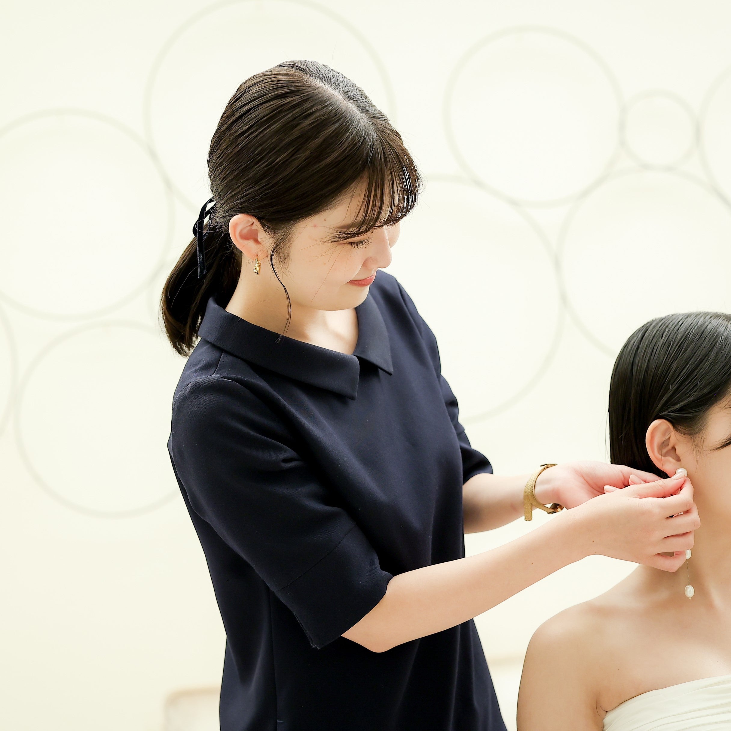 大学ではホスピタリティについて学び、卒業後は航空保安に関わる仕事に就職しました。多くの人と関わることにやりがいを感じていましたが、自分にはもっと一人ひとりのお客様とじっくり向き合うスタイルが向いているのではないかと考え、ブライダル業界への転職を決意しました。ドレスコーディネーターを選んだのは、挙式当日までの準備の中で、ご新婦様の「心に寄り添う」ことができる仕事だと感じたからです。また、一つの専門性を高めてみたいと思ったことも理由です。学生時代にブライダルのインターンシップに参加した際、ご新婦様の素敵な晴れ姿を拝見して「どんなふうにしてこの素敵なドレスを選ばれたのだろう?」と興味を持ったことも印象に残っていました。 MIRROR MIRRORは「鏡に映る自分を愛せるように」というメッセージを掲げています。接客業は「誰かのために」を大切にする仕事ですが、働く私たち自身が自分を大切にできていなければ、本当に良い接客はできないと考えています。MIRROR MIRRORのこのメッセージは、お客様だけでなく、働く私たちにも自分を愛することの大切さを伝えていると感じ、強く惹かれました。