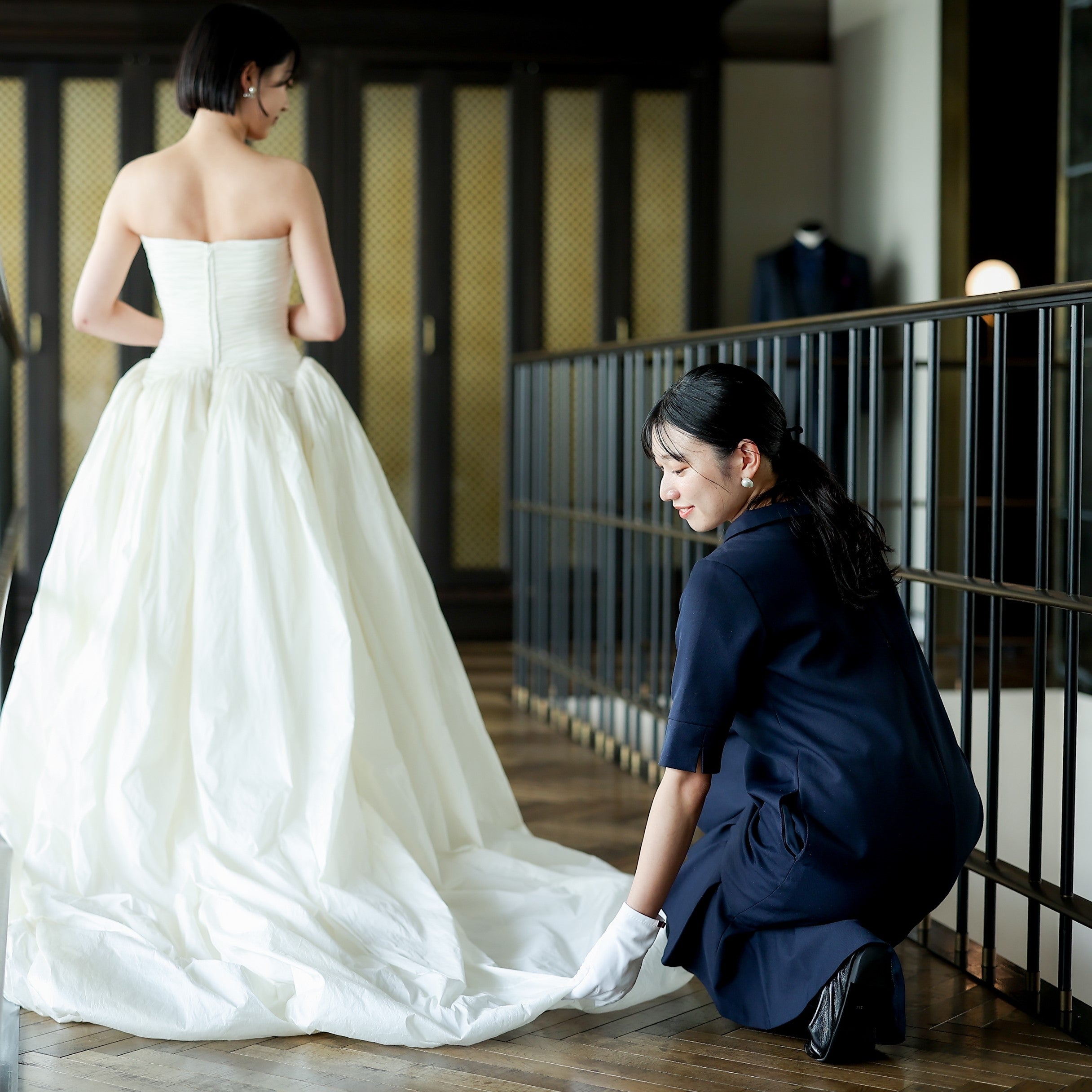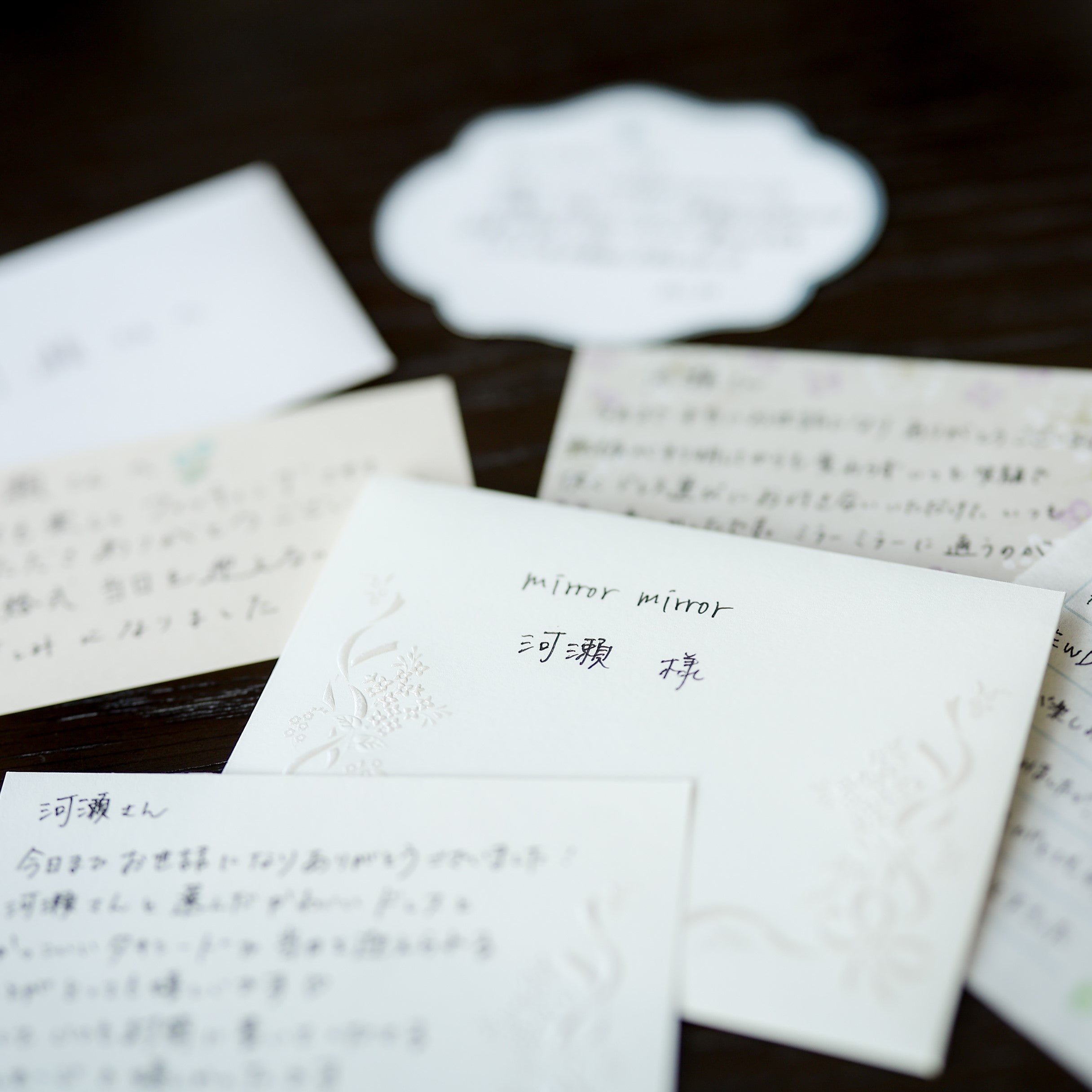 MIRROR MIRRORでは店舗ごとに1年間の目標を設定し、達成に向けてスタッフ皆で取り組んでいきます。入社したばかりの年、先輩方がその目標を達成して涙を流して喜んでいるのを目にした時、「本当にすごいな」と思いました。それが2年、3年と経験を重ねるうちに、自分も店舗の力になっている実感を持てるようになってきて。気づくと私も目標を達成した時、同じように心の底から喜んでいました。本当に誇りを持てる大好きな職場、大好きな仕事です。 私はお客様にも店舗の仲間に対しても「常に愛を持って接する」ことを心がけています。お客様は、どんな自分で結婚式当日を迎えたいのか、お一人ごとに異なる背景をお持ちです。しっかりとヒアリングして、思いを汲み取ったご提案ができるように日々努力を重ねています。店舗スタッフに対しては、自分がまだ新人で研修を受けていた頃、仲間や先輩にたくさん支えていただきました。最近は新しく入ってきたスタッフの教育にも少しずつ携わることが増えてきたので、私にできることがないか常に考えて行動しています。