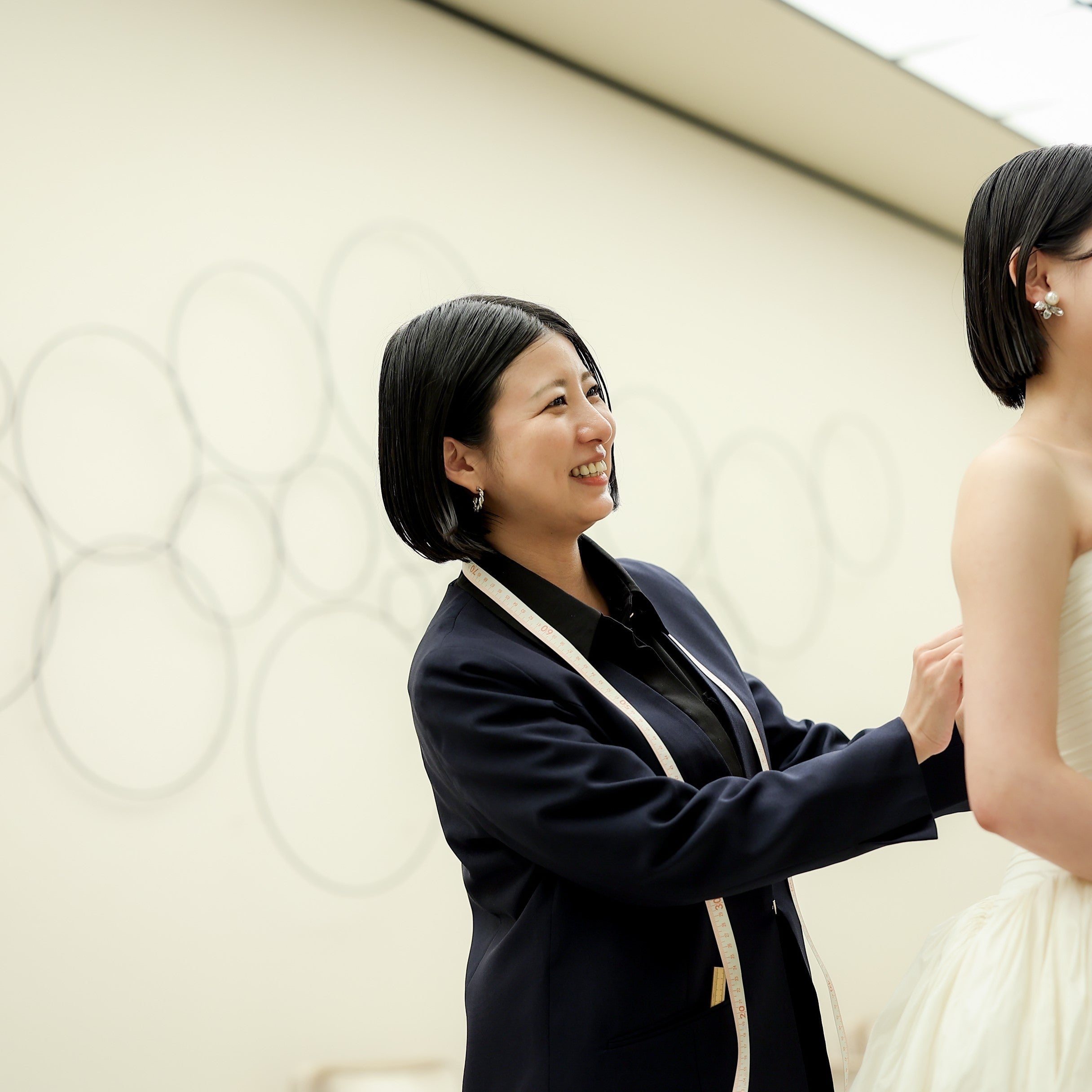 アトリエでは主に3つの業務を行っています。挙式当日の衣装のセッティング、式が近づいたご新婦様のためにサイズを最終調整するショップアトリエ、そして買い付けてきたドレスなどを店頭に出す前に検品する新作チームの業務です。私が特にやりがいを感じるのは、ショップアトリエのお仕事です。挙式当日に向けて、お客様がよりドレスを美しく着こなすためにお痩せになるなど、体型が変わる場合があります。その最終的な補正を行う業務です。ウエディングドレスとお色直しのカラードレスの2着を、限られた時間内でお客様の体型のお悩みにも寄り添いながら細部まで調整するのは、まさに職人の技術が求められる作業。決して簡単ではありませんが、だからこそやりがいがあります。 これまで様々なドレスの企業で働いてきましたが、大手ウエディングドレスのブランドで最終フィッティングにアトリエスタッフが立ち会うのは珍しいと思います。自分が補正したドレスをお客様がお召しになった姿を見られるのは、MIRROR MIRRORならではの魅力ですね。