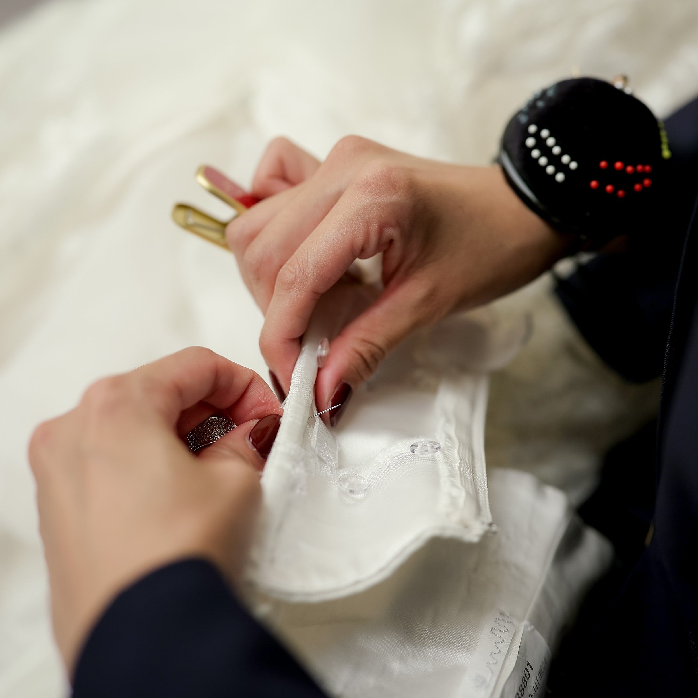 アトリエでは主に3つの業務を行っています。挙式当日の衣装のセッティング、式が近づいたご新婦様のためにサイズを最終調整するショップアトリエ、そして買い付けてきたドレスなどを店頭に出す前に検品する新作チームの業務です。私が特にやりがいを感じるのは、ショップアトリエのお仕事です。挙式当日に向けて、お客様がよりドレスを美しく着こなすためにお痩せになるなど、体型が変わる場合があります。その最終的な補正を行う業務です。ウエディングドレスとお色直しのカラードレスの2着を、限られた時間内でお客様の体型のお悩みにも寄り添いながら細部まで調整するのは、まさに職人の技術が求められる作業。決して簡単ではありませんが、だからこそやりがいがあります。 これまで様々なドレスの企業で働いてきましたが、大手ウエディングドレスのブランドで最終フィッティングにアトリエスタッフが立ち会うのは珍しいと思います。自分が補正したドレスをお客様がお召しになった姿を見られるのは、MIRROR MIRRORならではの魅力ですね。