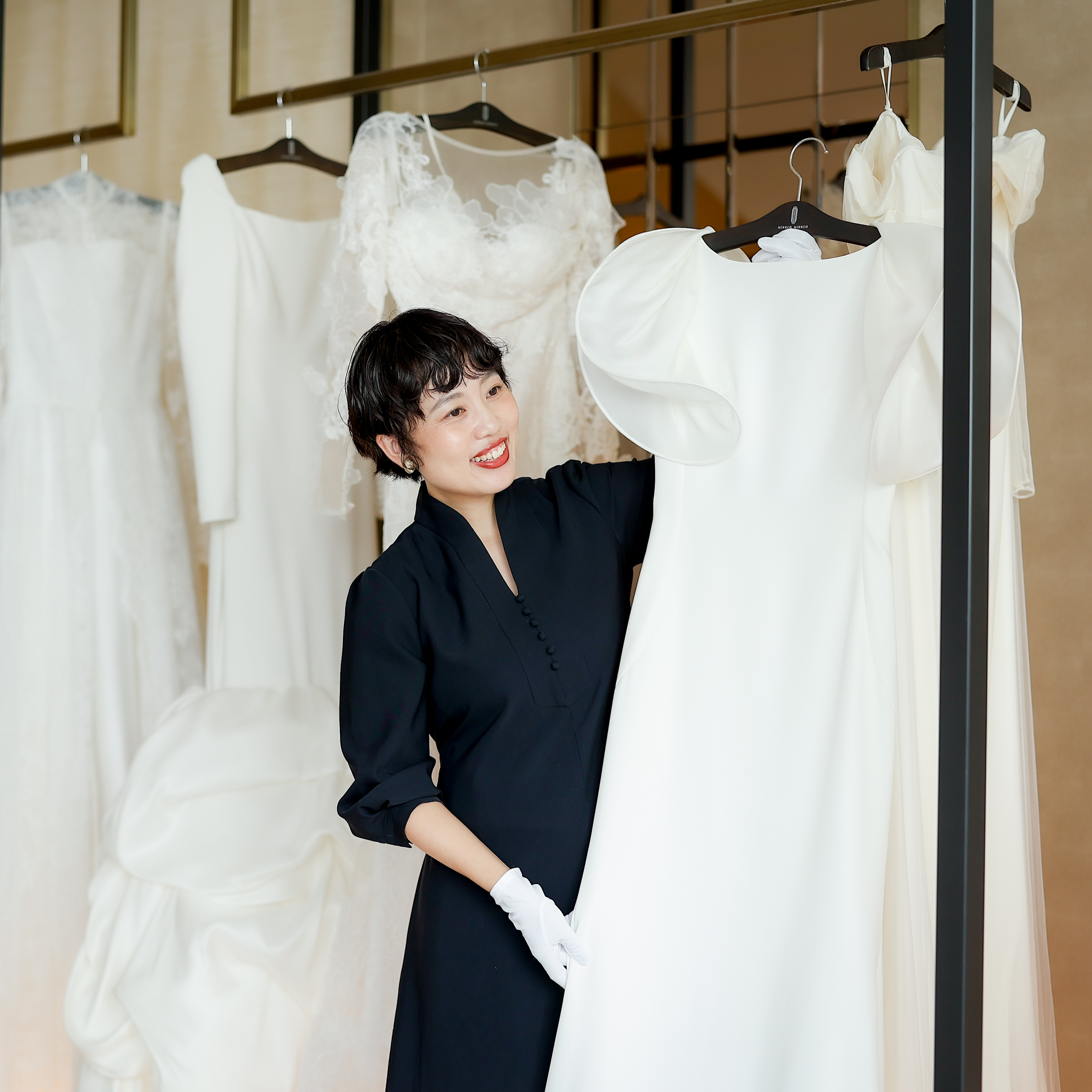 お客様にじっくり寄り添える環境でドレスコーディネーターをしたいと思い、決意した転職。面接先の一つがMIRROR MIRRORでした。母体であるT&Gの新規事業のオープニングスタッフ募集だったので、すでにカタチができ上がっているドレス会社よりは、自分の意見が通りやすいのでは? と興味を持ったのがきっかけでした。でも、面接を重ねていくうちに、この会社を強く志望するように。面接をしてくださった女性の先輩方がとても素敵だったんです。一人ひとりが強い意思と目標を持って、ぶつかり合いながらも皆で一つのものを目指す姿に惹かれて。私も30代、40代を彼女たちのように送りたい、一緒にその先へ行きたい---。そう思ったんです。そして、この会社ならやりたいことができると感じました。