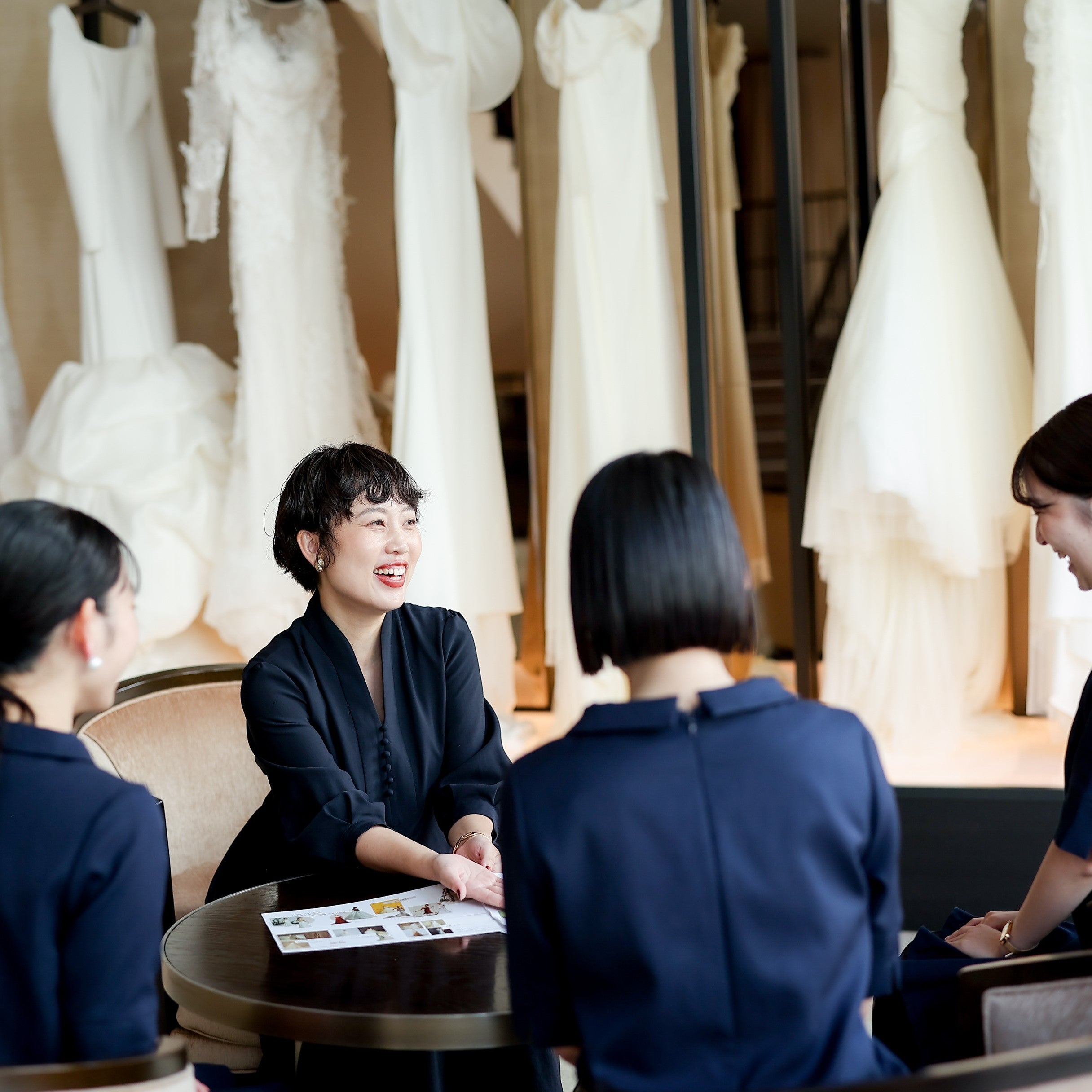 お客様にじっくり寄り添える環境でドレスコーディネーターをしたいと思い、決意した転職。面接先の一つがMIRROR MIRRORでした。母体であるT&Gの新規事業のオープニングスタッフ募集だったので、すでにカタチができ上がっているドレス会社よりは、自分の意見が通りやすいのでは? と興味を持ったのがきっかけでした。でも、面接を重ねていくうちに、この会社を強く志望するように。面接をしてくださった女性の先輩方がとても素敵だったんです。一人ひとりが強い意思と目標を持って、ぶつかり合いながらも皆で一つのものを目指す姿に惹かれて。私も30代、40代を彼女たちのように送りたい、一緒にその先へ行きたい---。そう思ったんです。そして、この会社ならやりたいことができると感じました。